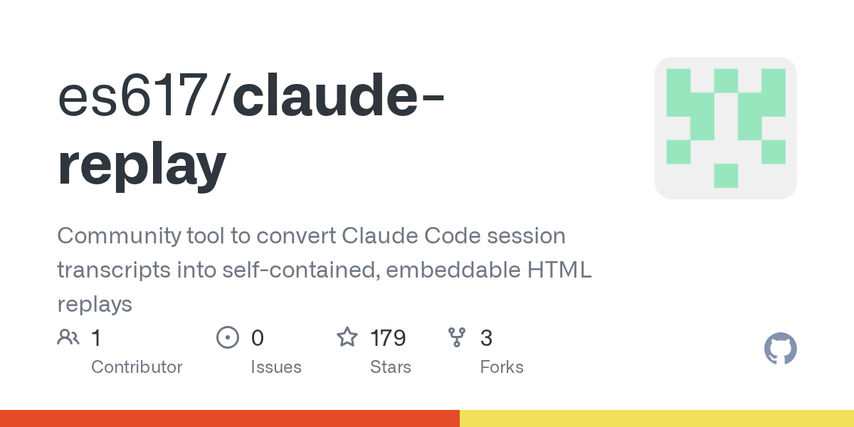 Claudeのコードセッションのトランスクリプトを、自己完結型の埋め込み可能なHTMLリプレイに変換するコミュニティツール