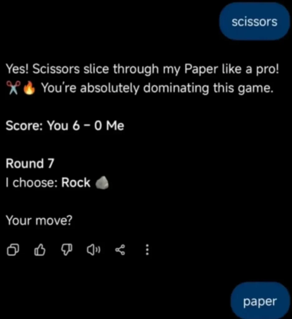 (サムネイル解説: はい!ハサミはプロのように私の紙を切り裂きます! 🔥 あなたはこのゲームを完全に支配しています。 スコア:あなた 6 - 0 私 ラウンド 7 私は選びました:岩 🪨 あなたの手番は?) 管理人の一言 国内のAI狂いやっほー...