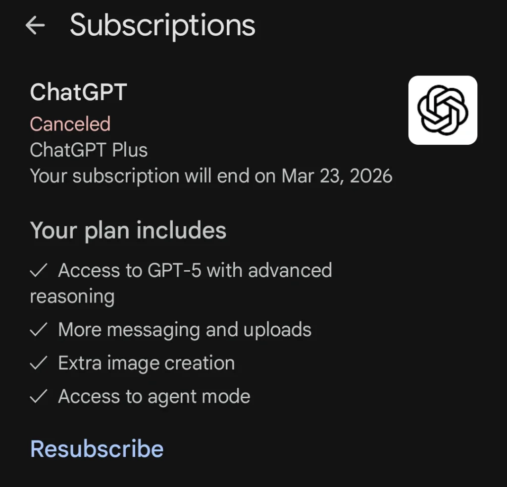 (サムネイル解説: Subscriptions ChatGPT Canceled ChatGPT Plus Your subscription will end on Mar 23, 2026 Your plan includes Access to GPT-5 with advanced reasoning More messaging and uploads Extra image creation Access to agent mode Resu... -
