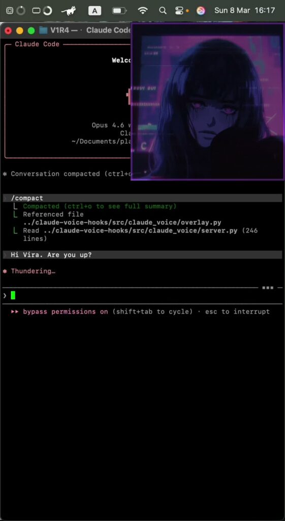 (サムネイル解説: Opus 4.6 v ~ / Documents/pl Compact (ctrl+o to see full summary) Referenced file ../claude-voice-hooks/src/claude_voice/overlay.py Read ../claude-voice-hooks/src/claude_voice/server.py (246 lines) Hi Vira. Are you up? T... -