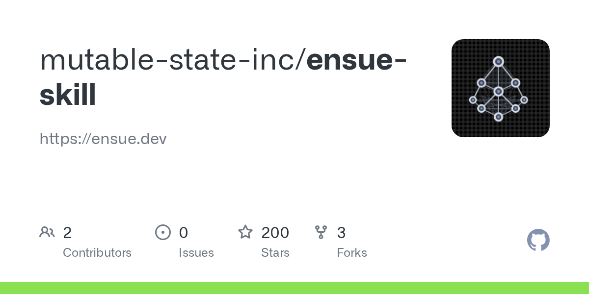 (サムネイル解説: mutable-state-inc/ensue-skill https://ensue.dev Contributors 2 Issues 0 Stars 200 Forks 3)