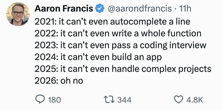 (サムネイル解説: 2021年: 一行すら自動補完できません 2022年: 関数一つすら書けません 2023年: コーディング面接にすら合格できません 2024年: アプリすら作れません 2025年: 複雑なプロジェクトすら扱えません 2026年: ああ、なんてこった) 管理人の... -