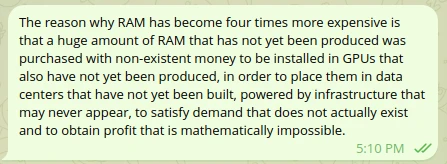 (サムネイル解説: RAMが4倍も高価になった理由は、まだ生産されていない大量のRAMが、まだ生産されていないGPUに搭載するために、実在しないお金で購入され、それらのGPUは、まだ建設されていないデータセンターに配置され、おそらく現れないインフラスト... -