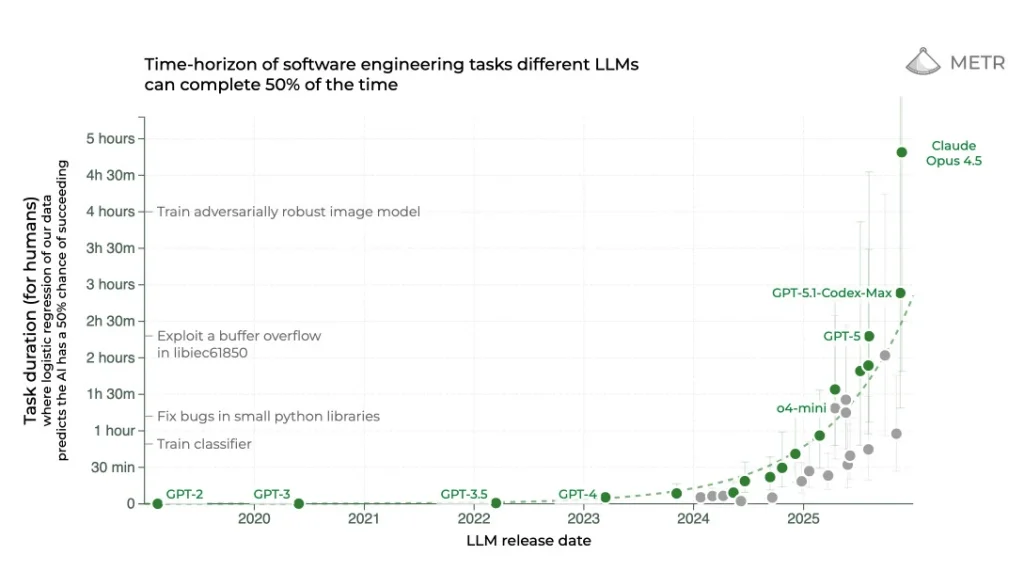 (サムネイル解説: LLMリリース日における、50%の時間で完了できるソフトウェアエンジニアリングタスクの時間的範囲) 管理人の一言 国内のAI狂いあけましておめでとう!「国内のAI狂い」の管理人だよ!2026年がついに幕を開けたね。2022年末のChatGPTショ... -