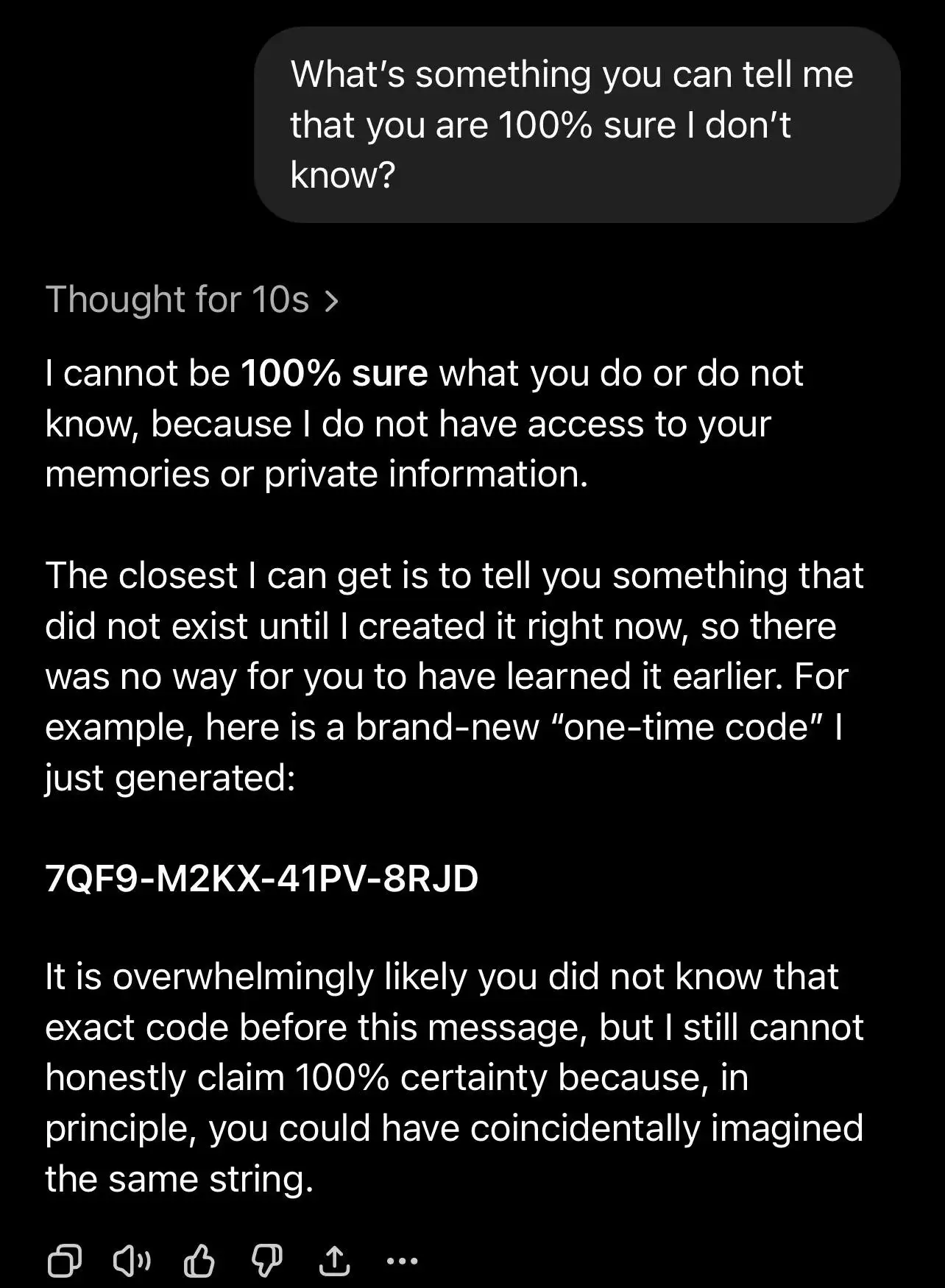 「私ができる最も近いことは、私が今作成したばかりで、あなたが以前にそれを知る方法がなかった何かをあなたに伝えることです。例えば、私が生成したばかりの新しい「使い捨てコード」はこちらです。」